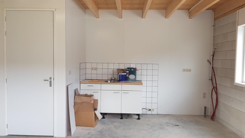 • Betonnen vloer in de kantoor-/kantineruimte, v.v. voorbereiding voor vloerverwarming (na installatie warmtepomp)