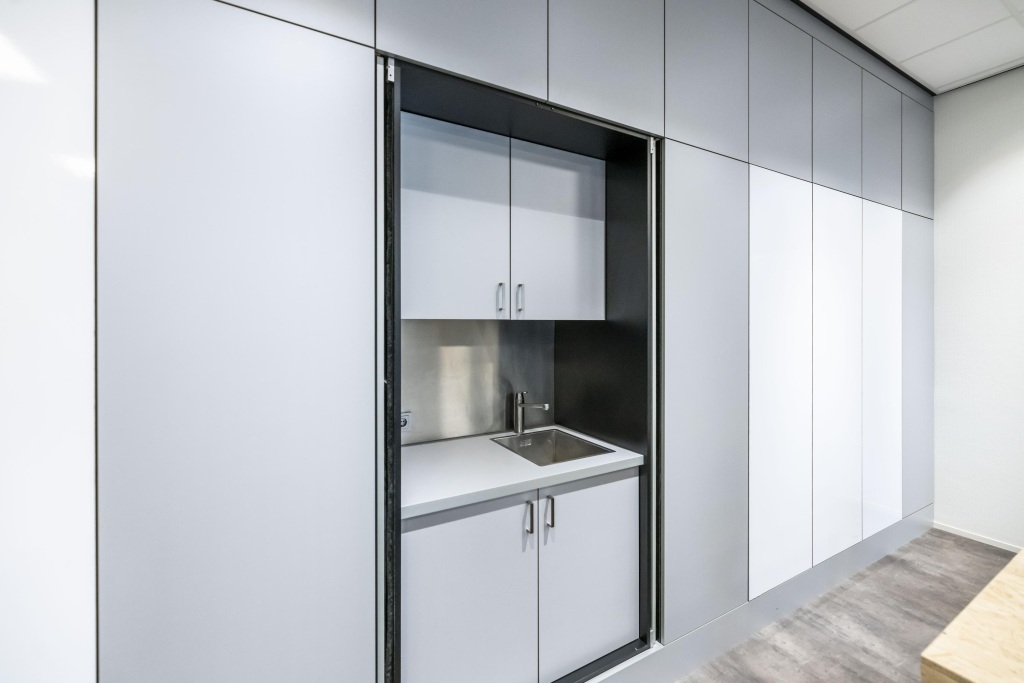 • pantry met onder- en bovenkastjes geïntegreerd in kastenwand.