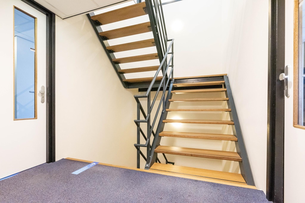 • stalen trapopgang met houten treden en bordessen
